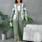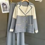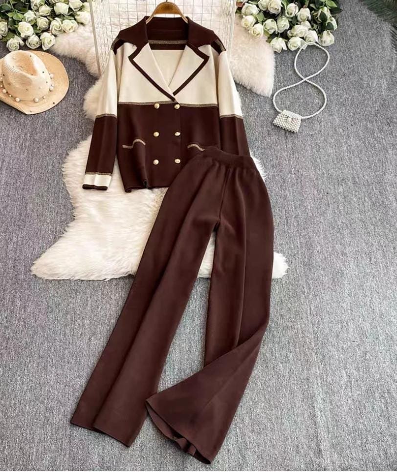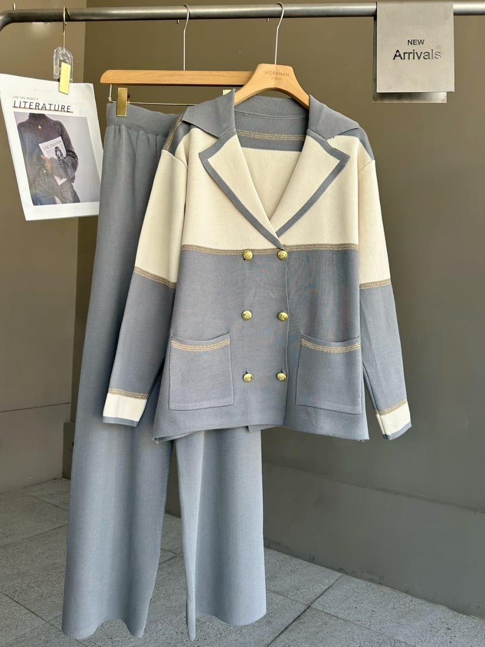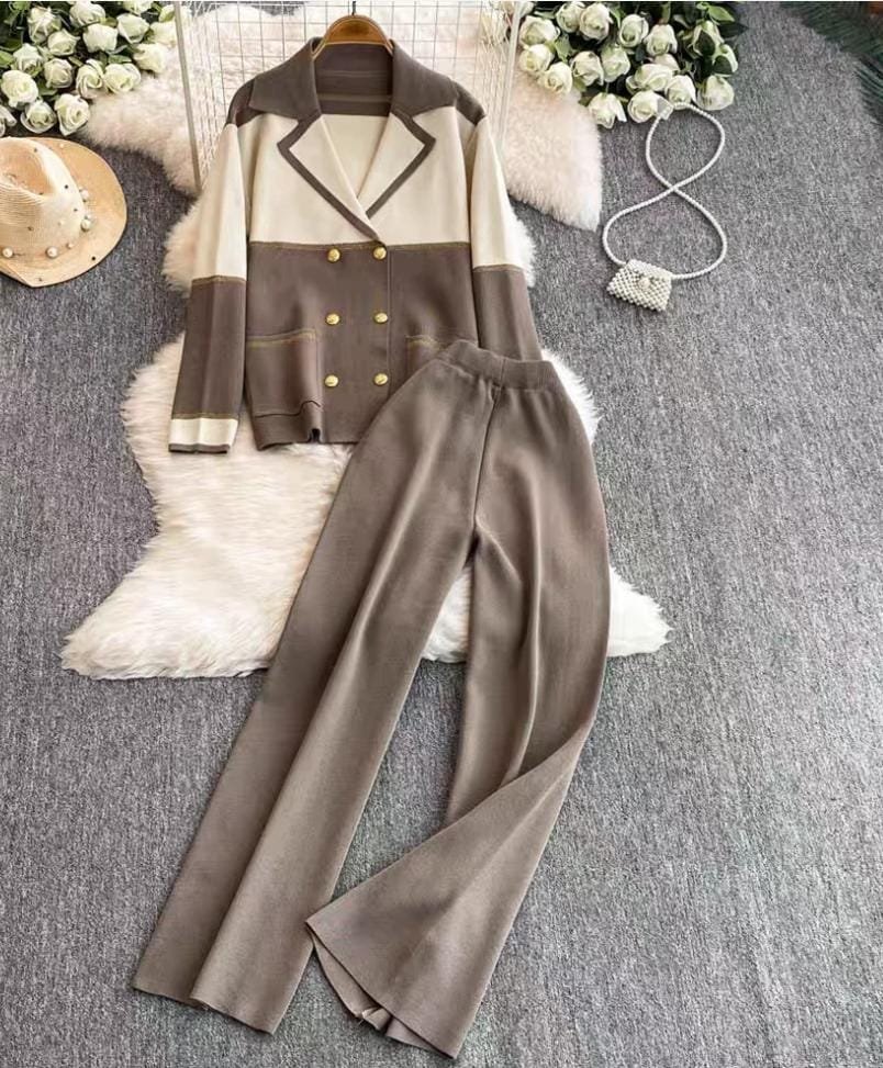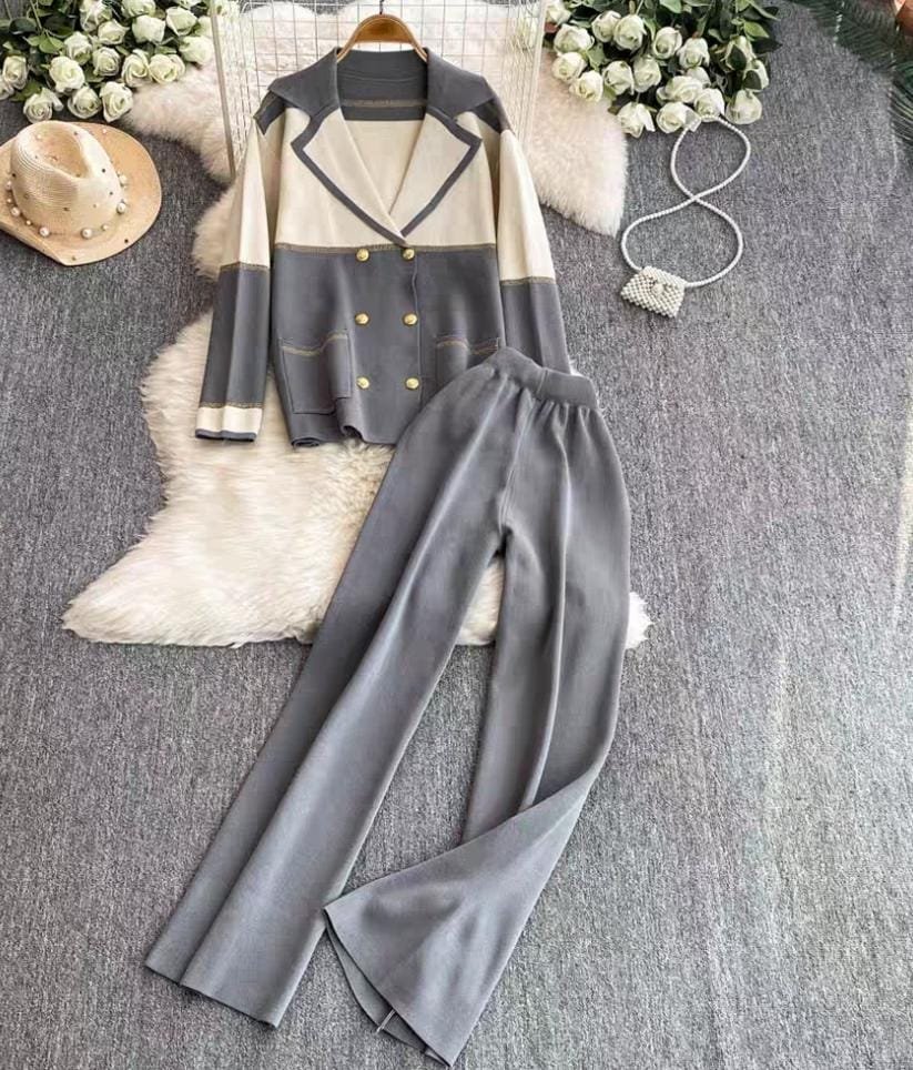 This two-piece suit set features a sophisticated double-breasted blazer with gold button detailing, highlighted by soft cream and grey panels for a subtle yet chic contrast. Paired with wide-leg trousers, this outfit blends effortless style with supreme comfort. Perfect for formal meetings, brunch outings, or travel days!