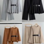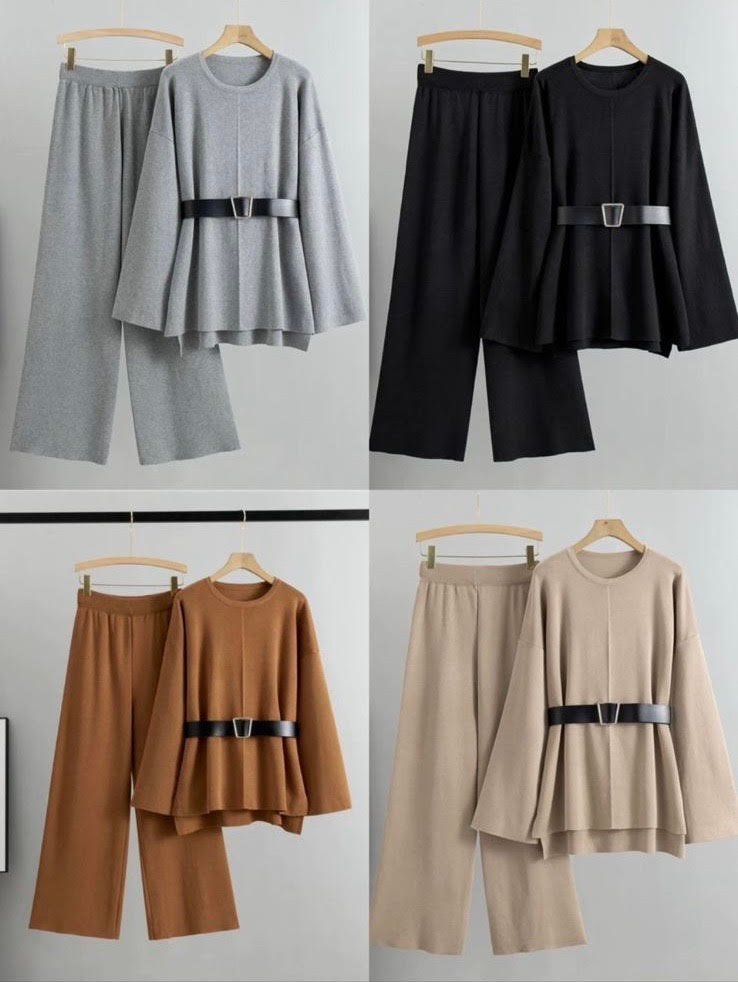 This two-piece outfit redefines cozy sophistication with its relaxed-fit top and wide-leg trousers. The addition of a sleek, cinched waist belt adds structure and flatters every silhouette. Available in versatile shades like grey, black, caramel, and beige, this set is perfect for casual outings, work-from-home chic, or elevated loungewear.