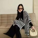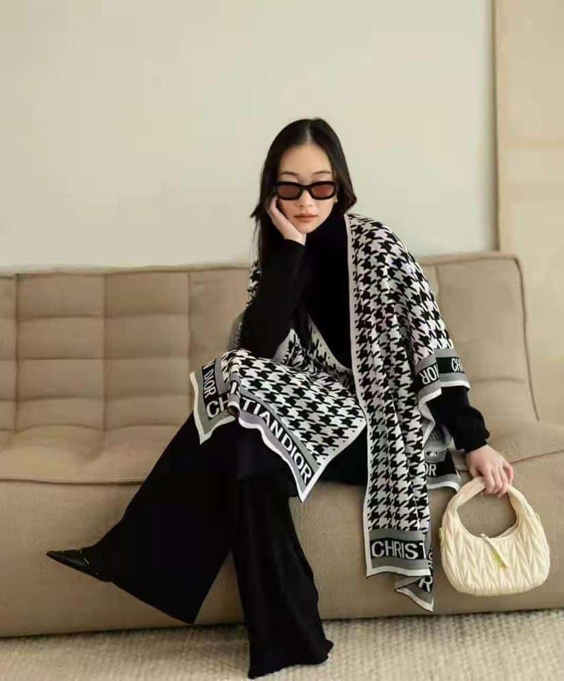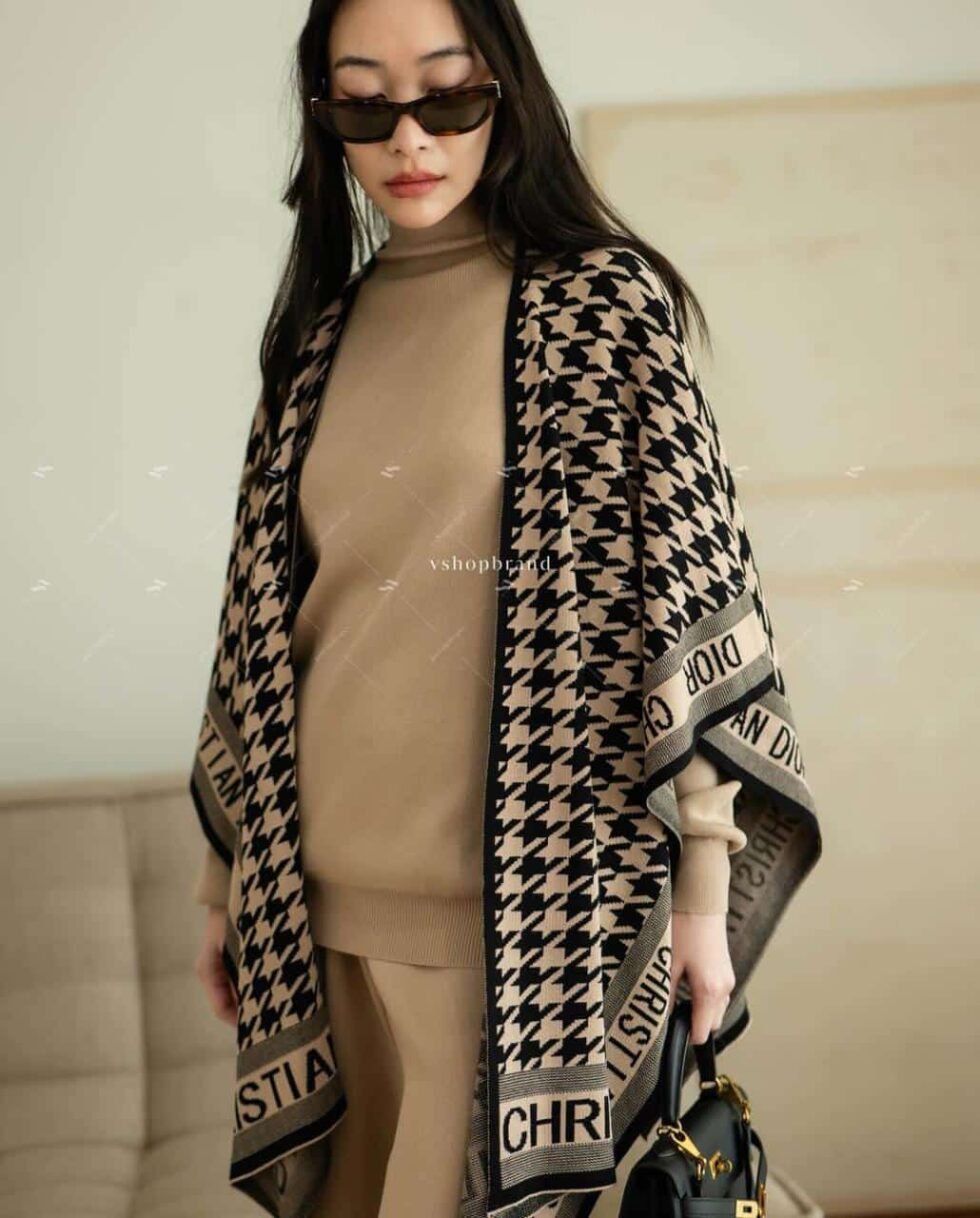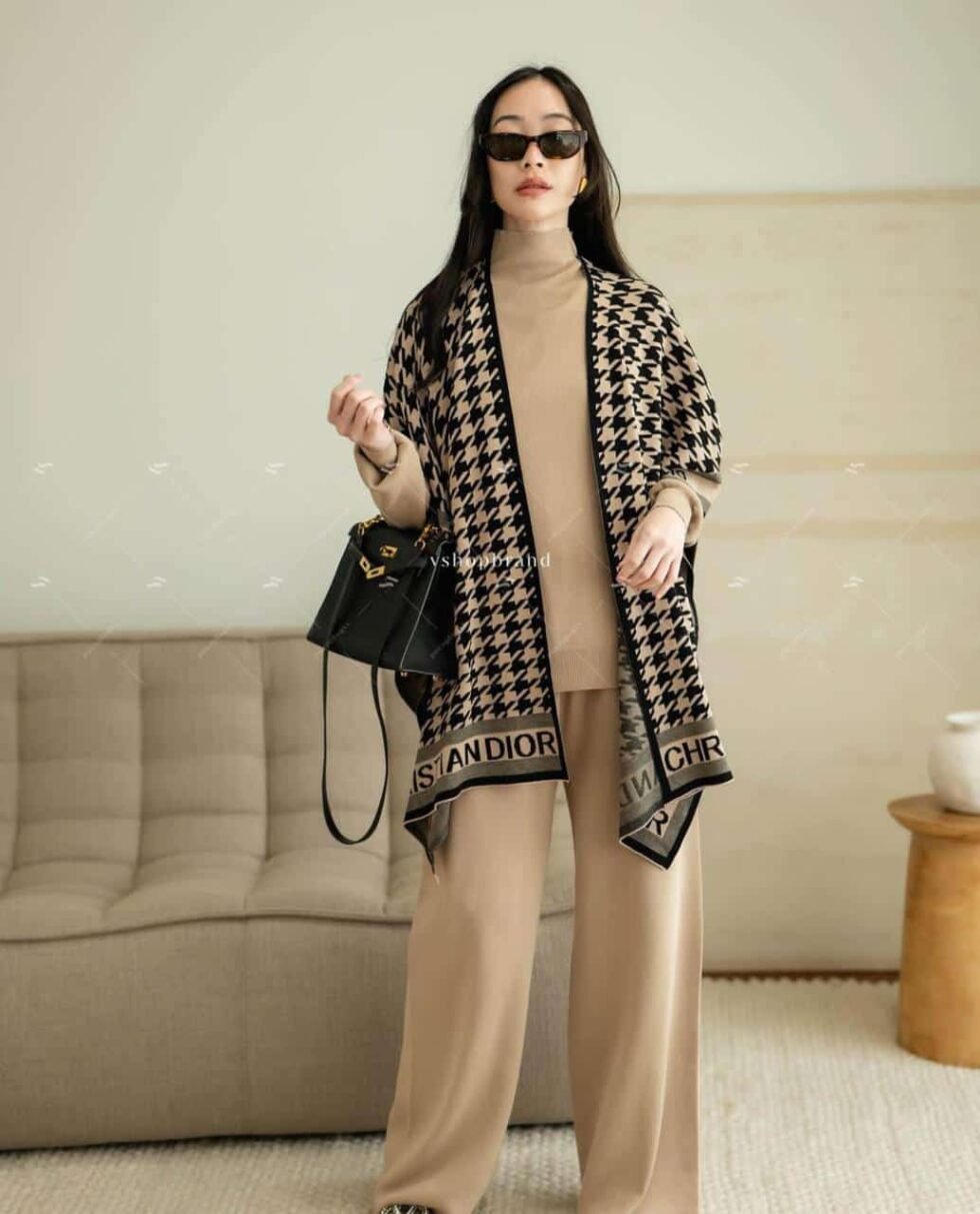 Turn heads this season with our chic and sophisticated co-ord set, featuring a classic camel-toned turtleneck and wide-leg trousers. Layered with a striking houndstooth-patterned shawl adorned with bold logo detailing, this ensemble is the epitome of modern luxury.